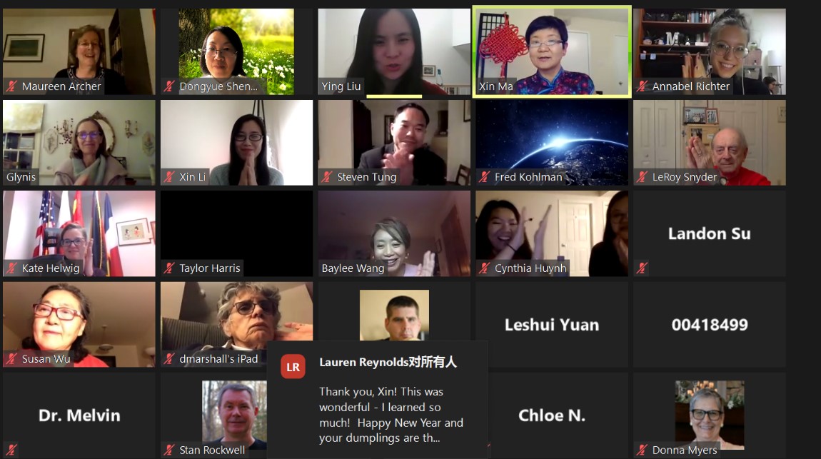 马欣老师的讲座生动有趣、洋溢着浓浓的生活气息和中国传统文化的底蕴。她用自己的亲身经历和真是的小故事,展现给听众一个真实的中国春节的发展,听众热情喜乐地回应。在讲座问答环节,有美国朋友问到中国的新年除了祝福发财之外,还有那些祝福?还有人问到,2021年是牛年,中国人是不是就不吃牛肉了?也有人问到,自己有中国朋友送的中国结,如何陈列?还有希望孔院能够推荐一些中国文化的图书,他们想了解更多。 对于这些问题,马欣老师都给出了实事求是、妙趣横生的来自文化、来自生活的解答。