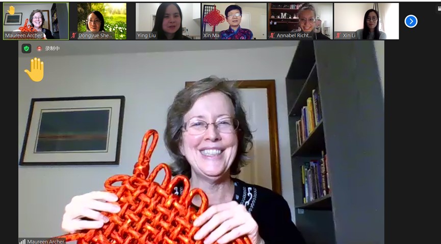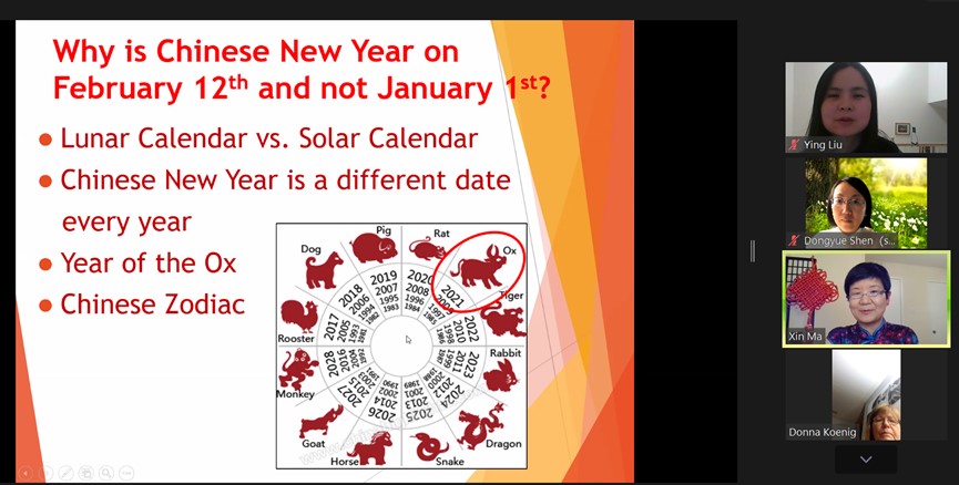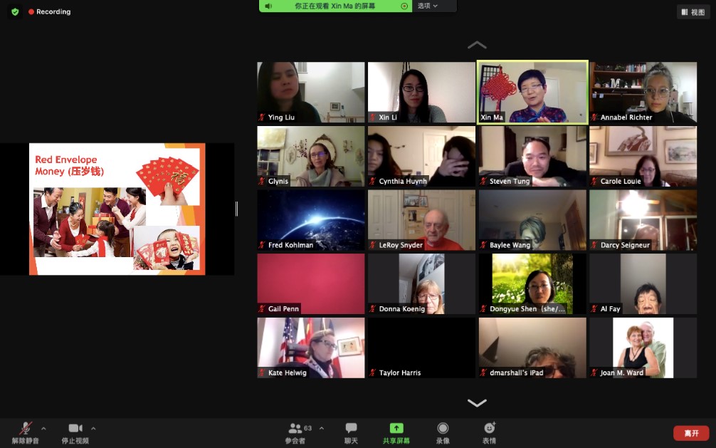 活动由威廉玛丽学院孔子学院美方副院长刘颖博士主持。马欣老师身着一袭旗袍,身后以大大的中国结做背景,首先祝贺与会人员2021中国新年(牛年)快乐,接着,她系统详尽地介绍了春节的文化内涵、现实影响和未来趋势。