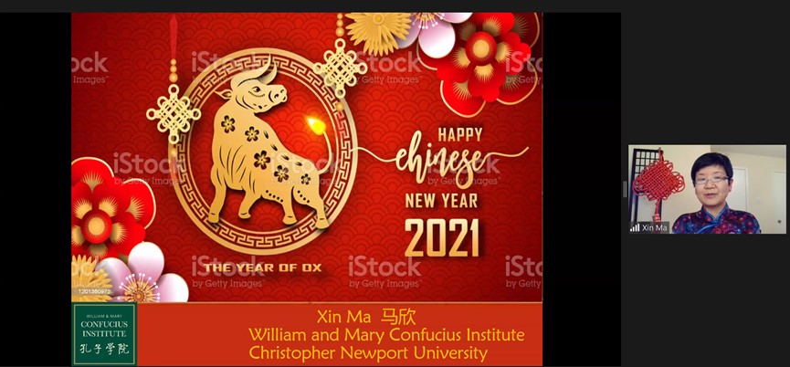 值此2021年中国传统牛年新春来临之际,威廉玛丽大学孔子学院(WMCI)和纽波特纽斯市姐妹城市(SCNN)联合特邀请威玛孔院和克里斯托弗新港大学(Christopher Newport University,CNU)中文教师马欣老师于2月10日晚上7:00-9:00(中国农历牛年除夕之前)通过Zoom,向威廉玛丽学院和克里斯托弗纽波特大学师生以及威廉斯堡社区的中国文化爱好者主讲了“Chinese New Year: Traditions and Trends《关于中国新年的传统和趋势》为主题的云端庆祝活动。活动赢得了外国友人的浓厚兴趣、参与热情,吸引了近70多人参加。