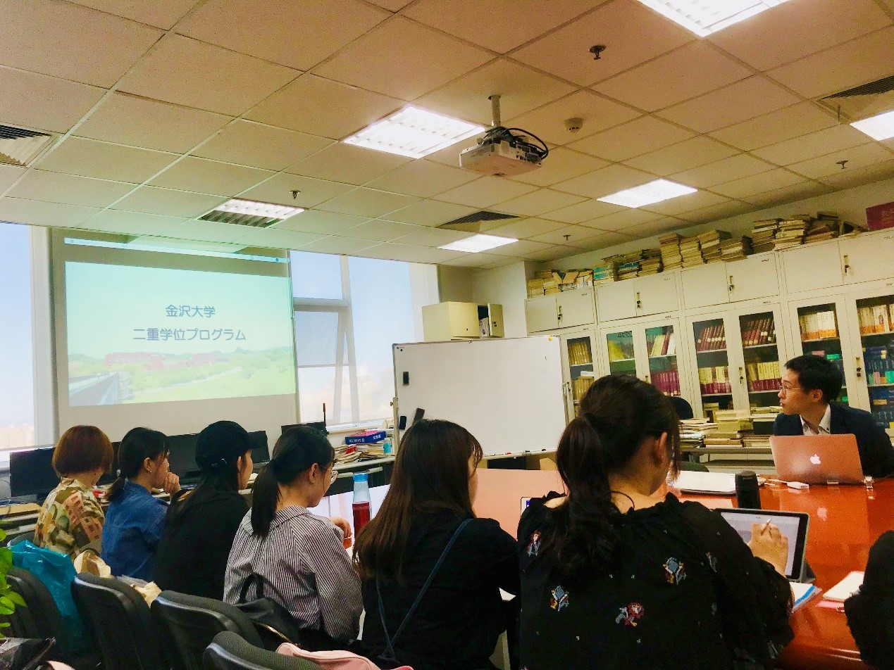 2019年9月18日,北京师范大学-金泽大学(日本)研究生双学位项目说明会于后主楼1018日文系资料室举行。金泽大学人间社会环境研究科深泽希美教授、大江元贵老师负责介绍项目具体内容,北师大日文系研究生、往届该双学位项目交换留学学生、以及金泽大学国际学专业研究生、本科生参加了此次说明会。