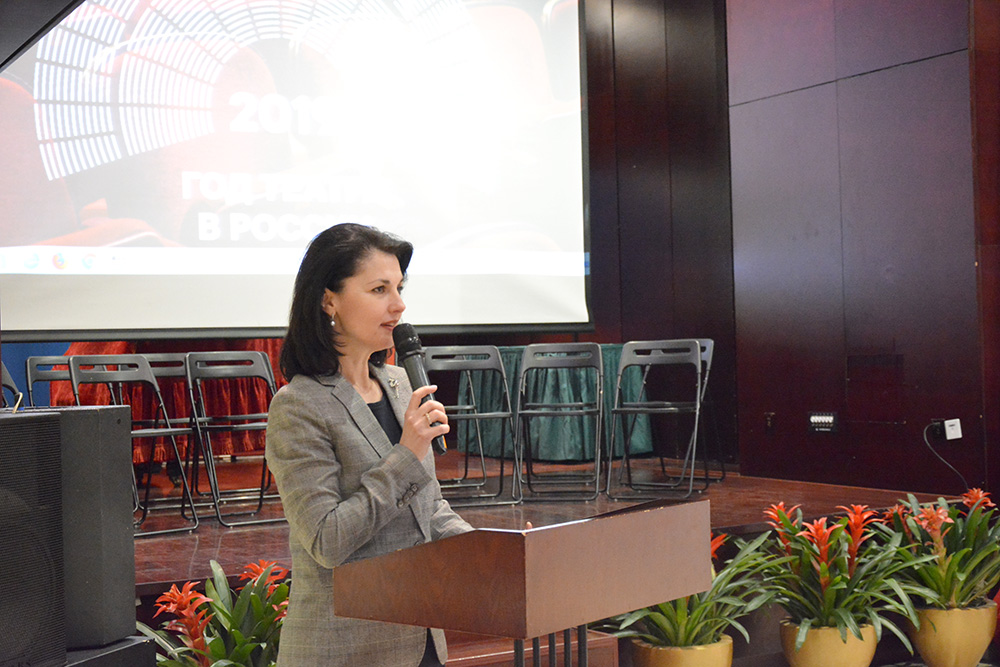 会议开始时,北京俄罗斯文化中心负责人奥莉佳·安德烈耶夫娜·梅里尼科娃(Ольга Андреевна Мельникова)首先向所有前来参加晚会的师生们表示衷心的感谢并做了精彩致辞。在其致辞中,她详细阐述了果戈里作为俄罗斯乃至世界历史上伟大的作家为世界文坛所做的贡献,同时也强调了文学对于人们生活的社会产生的重要影响。