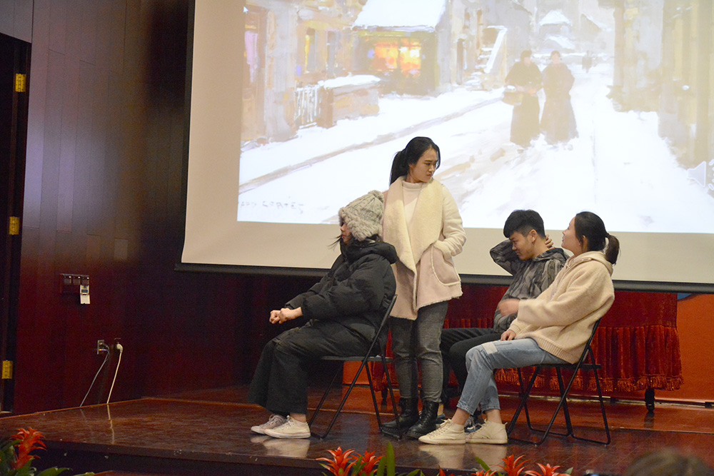 第二个节目是由外围买球app十大平台官网大三年级改编的契诃夫作品《苦恼》。参演同学经过一个月的辛苦排练,凭借自身精湛的演技、深厚的台词功底,在舞台上把作品中所反映的沙俄时期世态炎凉、人心冷漠的残酷现实表现地淋漓尽致。
