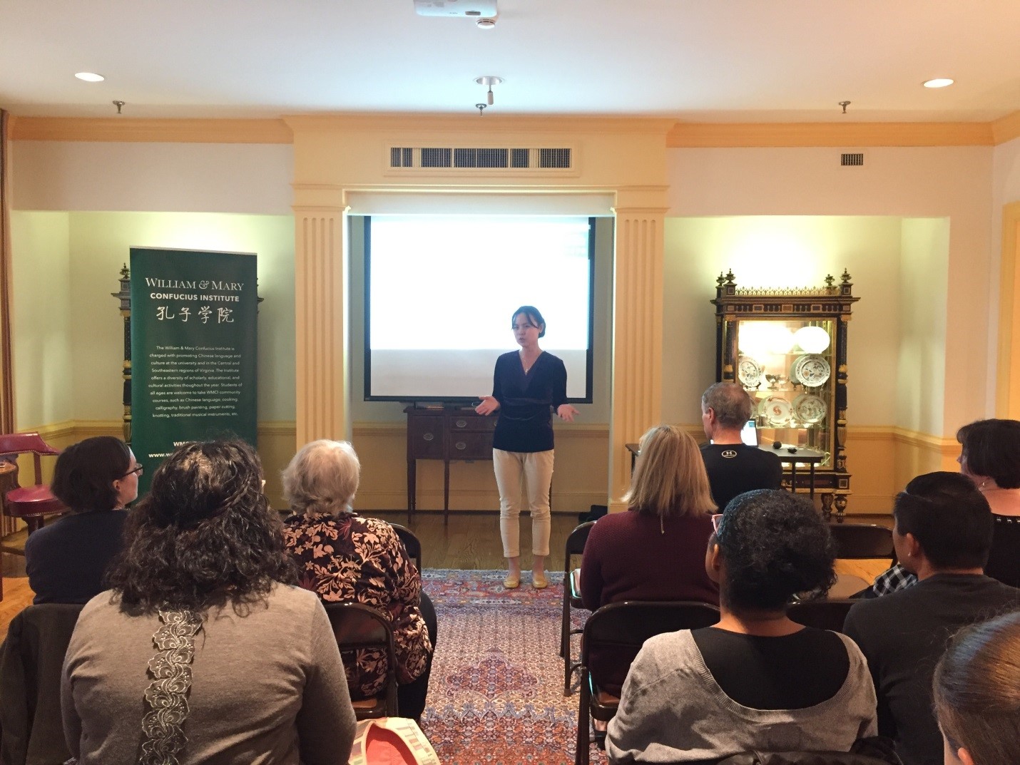 讲座开始前,威玛孔院美方副院长刘颖博士致词,她讲到“威玛孔院是在威廉玛丽大学、北京师范大学和国家汉办三方合作下成立的、旨在推广汉语,促进中国语言和文化研究,支持威廉玛丽大学中文教学,促进中美文化交流的教育和服务机构。本次讲座正是其意义的重要体现。”