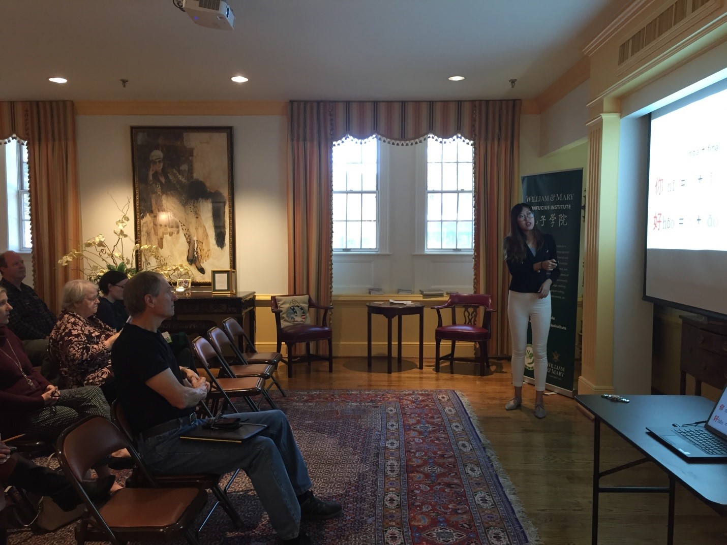 美国当地时间10月30日中午,威廉玛丽大学孔子学院(以下简称“威玛孔院”)志愿者教师代迪欧、程冕做了一场 “汉语速成”讲座。本次活动向威廉玛丽大学的教职工讲解了中国拼音体系、姓名文化、常用表达和中美文化差异等内容,目的是让他们对汉语和中国文化有一个初步的认知,以便他们能够了解中国留学生的特点,和中国留学生更好地沟通和交流,因为中国留学生是威玛所有的留学生中占比最大的群体,威玛对此比较重视。参加此次讲座的人员有威玛各个院系的教授、教务人员以及大学的后勤人员等。