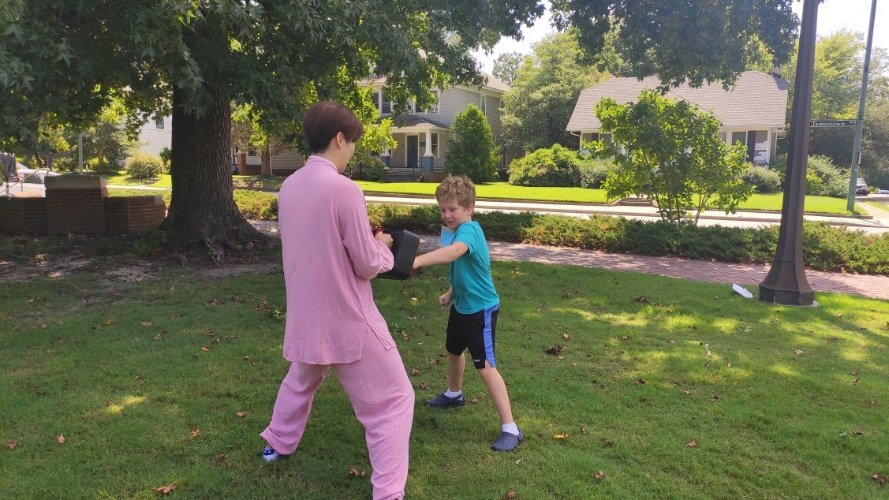 第二堂武术课,冯老师带孩子们进行了中国传统武术基本功中的三种柔韧训练:正踢、里合、外摆。6岁的Gloria(海晴)年龄虽小,但有武术功底,也十分喜欢中国武术,个头小小的她踢起腿来像模像样,给其他孩子们做出了标准的示范。