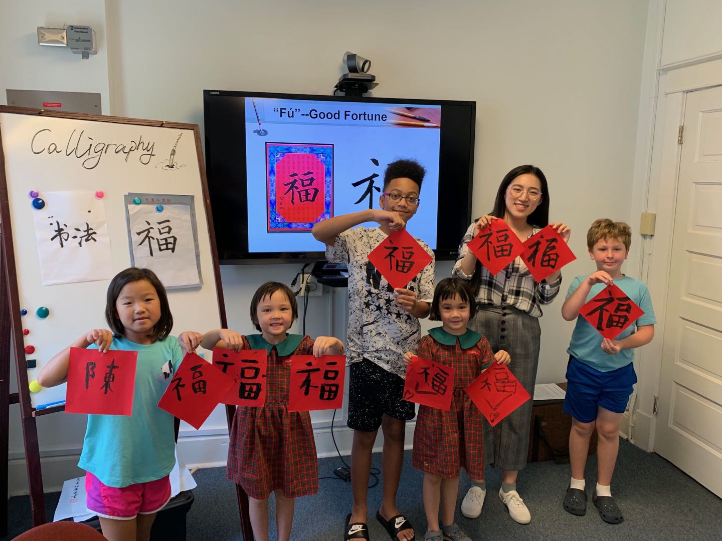 书法课上,林老师以视频展示和知识竞答的方式让大家了解了中国书法的历史发展和基本字体等,并教授了握笔执笔方法及基本笔画。在林老师的指导下,孩子们完成了自己的第一个中国字“福”。华裔女孩Eleanor还学会了写自己的中国姓“陈”。