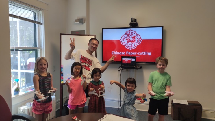 8月9日,在最后一天的课程中,侯老师向大家展示了中国剪纸艺术的魅力,并指导孩子们如何剪出栩栩如生的熊猫和金鱼。