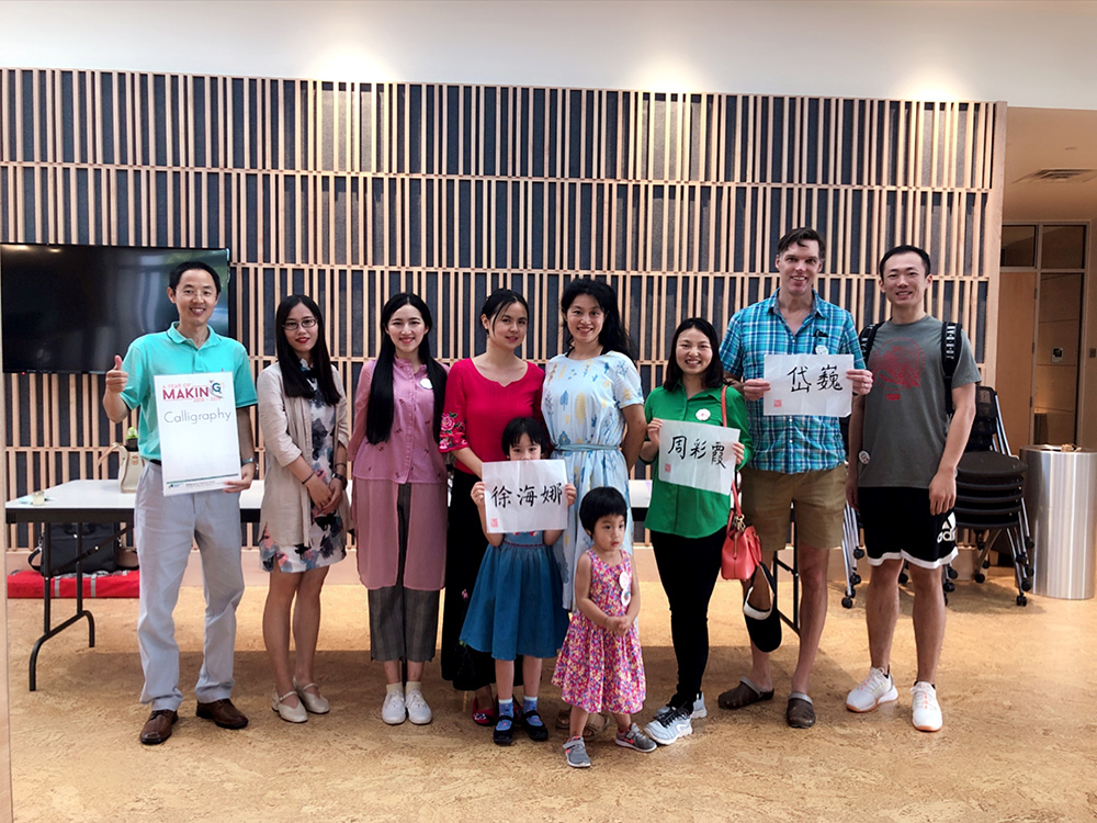 在本次活动最精彩的体验部分,孔院的志愿者和教师们会用毛笔为每位参与者写出他们的中文名字,一个个英文名字脱落成古色古香的楷书—如岱巍、卓森、爱莉等等。参加活动的每个人都对自己的中文名爱不释手,书法摊位前络绎不绝,活动现场更是出现“人手一纸”的盛况。