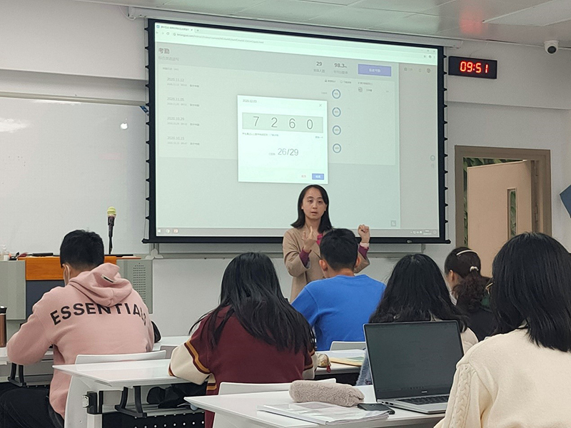 2020年12月2日至3日,外围买球app十大平台官网英文系主任王楠老师、副主任孙晓慧老师赴珠海校区调研。此次调研两位老师分别听了珠海分校戴佳老师所教授的《综合英语读写》和吴文霞老师所教授的《英国文学史》,与在珠海授课的英文系教师苗兴伟老师、罗少茜老师、蒋虹老师进行了座谈,向珠海校区未来教育学院副院长胡永建老师请教了有关助教工作量等问题,同时与2020级英语师范专业学生,2019级英语专业学生以及2020级教育硕士进行了座谈,了解了学生的学习和生活情况。