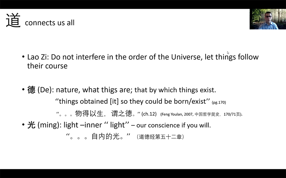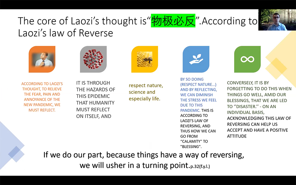 在本次线上讲座中,主讲人审视了老子对人性二重性的观念,并辩称我们不是我们自己,我们依靠的是支配我们生存的规律。老子的道与全人类和全球疫情息息相关,主讲人通过对道的探索进而使我们更了解自身,找寻应对疫情之道。