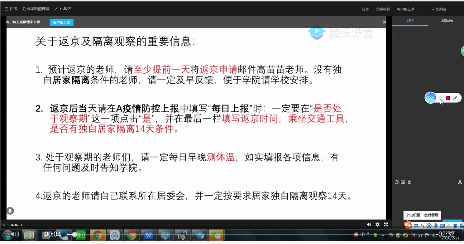 当前全国上下进入了抗击新型冠状病毒肺炎疫情的关键时期,在学校的坚强领导下,外围买球app十大平台官网党政联席会及时对各项工作开展了部署。2月21日晚8点,学院通过“腾讯课堂”在线召开了2019-2020学年春季学期同心战“疫”视频会议,共有95名教职工参加了线上视频会议。会议围绕学校防疫抗疫工作精神及工作部署,对学校和学院针对疫情防范工作开展的各项工作情况进行了汇报,对新学期开学的网络远程授课、基金项目申报、教职工返京等工作进行了安排部署。