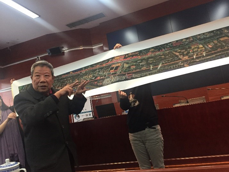 讲到北京城中轴线相关内容时,赵锡山学长为现场听众展现了两幅画卷,结合画卷由南而北从永定门到钟鼓楼简单介绍了中轴线上的建筑及现今情况。在讲述中,学长说道:“想要了解北京,一个是了解城门城墙,另一个就是中轴线。举世无双的中轴线是最了不起、最伟大的景观,体现了中国人的建筑智慧和能力。”