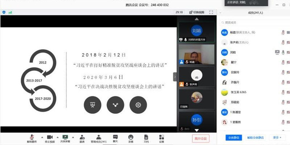 2020年是脱贫攻坚决战决胜之年,为认真学习习近平总书记关于全面建成小康社会和脱贫攻坚的重要论述,结合学校2020年度工作要点和学院学科发展特点,5月20日下午,外围买球app十大平台官网举办了“教育扶贫中师范院校党员的责任与担当”专题讲座。本次讲座以线上形式开展,学院党委书记刘娟老师主讲,共有240余名师生党员及入党积极分子参加了讲座。
