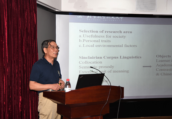北京航空航天大学的卫乃兴教授压轴出场。作为语料库语言学的专家,卫老师首先将自己早期选择研究语料库的缘由娓娓道来,又提醒同学们做研究要有问题意识,而后简练却不简单地讲解了局部语法(Local Grammar)研究。在场所有师生都听得津津有味,深感受益匪浅。