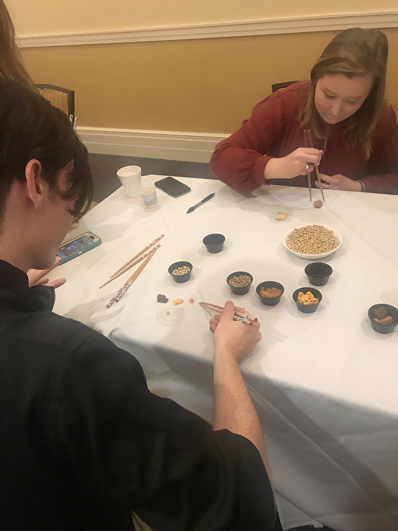 CNU中文项目学生自己组织的筷子夹东西活动也很有创意,他们采用计时竞赛和两人PK竞赛的方式,用葵花籽、黄豆、 果脯、面包干等物品分出筷子竞赛的难度等级。大家纷纷拿起筷子不断尝试,一次次挑战自我。