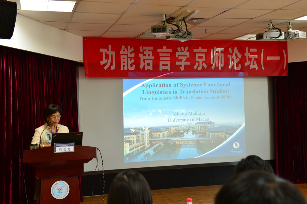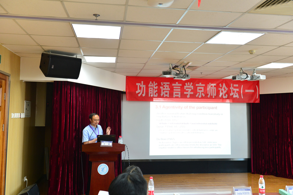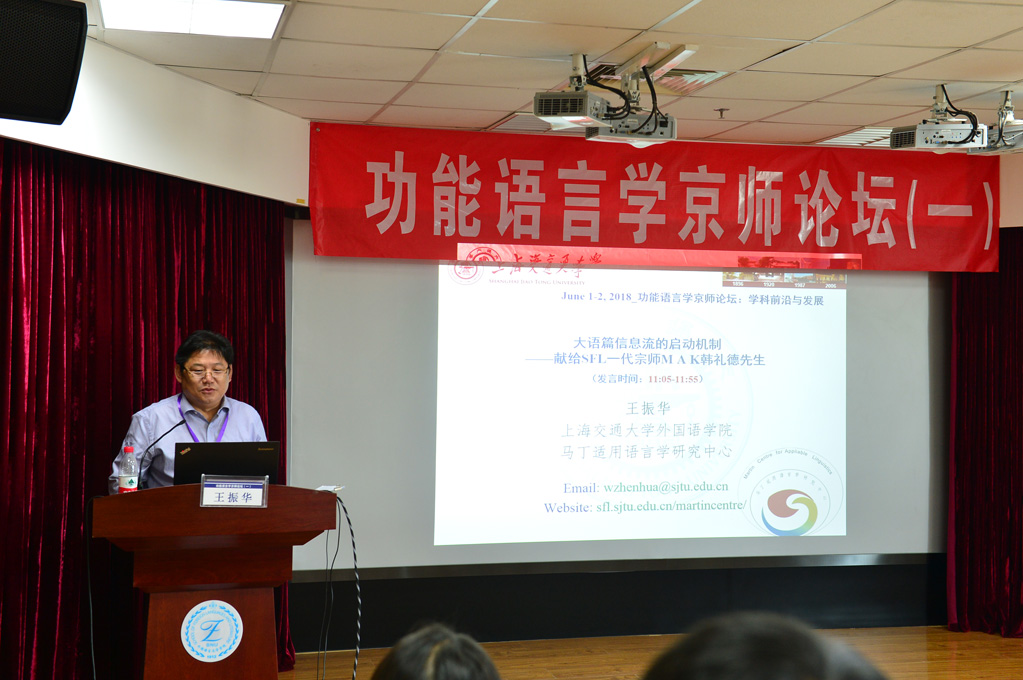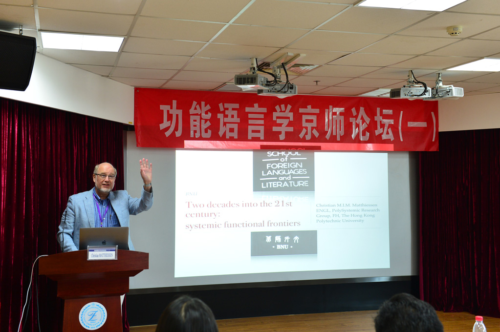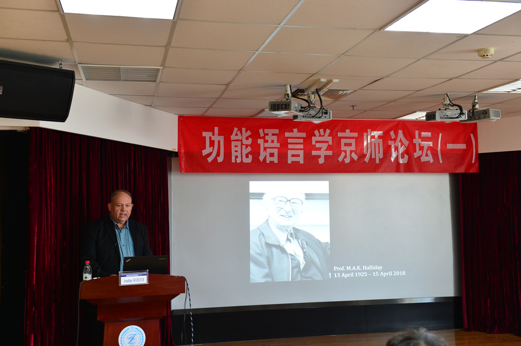 为纪念伟大的语言学家、系统功能语言学创始人韩礼德先生,促进功能语言学在我国的发展,学院于1日 “功能语言学京师论坛Christian M.I.M. Matthiessen教授、北京第二外国语学院司显柱教授、华中师范大学王勇教授、上海交通大学王振华教授、香港城市大学Jonathan Webster教授分别致辞。与会代表集体合影后,七位专家分别做了主旨发言,分别为:张美芳教授“Matthiessen教授“SFL一代宗师A review of the disputes on the finite and non-finite distinction”;王勇教授 “Appliability, Trans-theoreticality and Multimodality: Towards a Systemic Functional Model of Multimodal Metaphor Analysis”。
