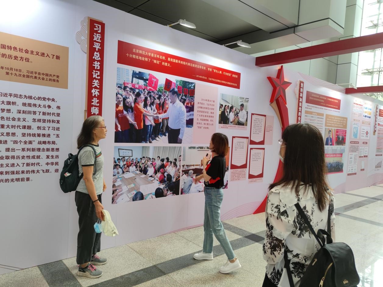 大会直播结束后,党员教师们来到主楼的四季厅,集体参观了由学校党委主办的“红色师范与百年传承——北京师范大学庆祝中国共产党成立100周年”主题展览。大家逐一学习了“红色基因薪火相传”、“不懈探索砥砺前行”、“改革春天蓬勃发展”和“新时代新征程”四个单元的展出内容,不时驻足讨论、交流心得感悟。