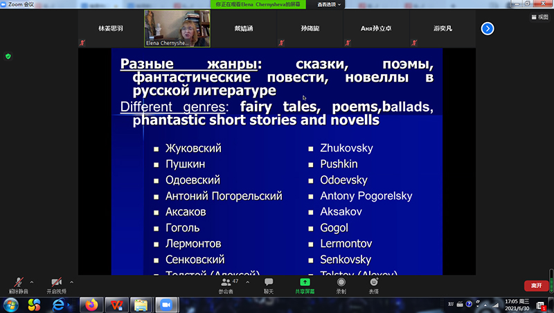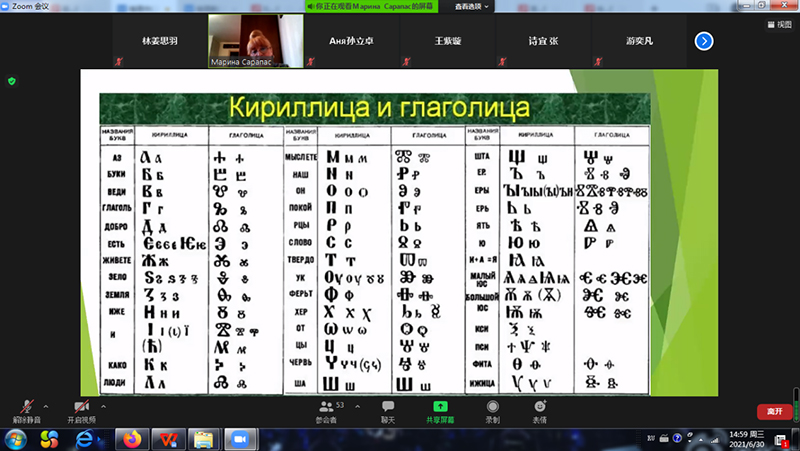 2021年6月28日—7月1日,俄文系成功举办了暑期小学期系列讲座活动。系列讲座共有六场,其中中国专家的讲座两场,包括南京师范大学张杰教授的“人工智能时代的社会科学研究”、北京师范大学杨衍春教授的“语言国情学:跨文化交际的基础”),俄罗斯专家的讲座四场,包括莫斯科国立师范大学萨拉帕斯副教授的“俄语字母与俄罗斯文化”与“俄语成语中的文化习俗”、莫斯科国立师范大学切尔内舍娃教授“俄罗斯神话中的文化元素”与“俄罗斯的民间童话”。