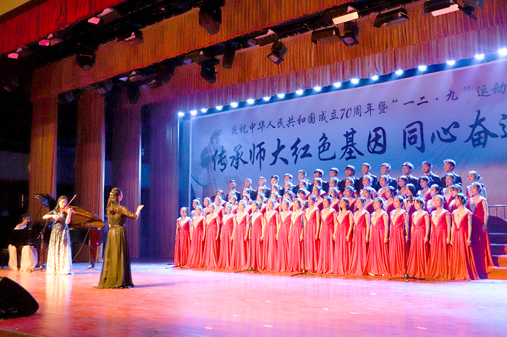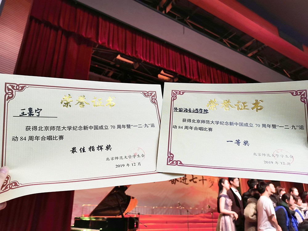 2019年12月8日晚六点半,北京师范大学“传承师大红色基因,同心奋进七十梦圆”庆祝中华人民共和国成立七十周年暨纪念“一二·九”运动84周年合唱比赛在学生活动中心顺利举行。外围买球app十大平台官网压轴出场,以一曲《新的天地》登台演出。合唱队由王嘉宁同学担任指挥,任紫君同学担任钢琴伴奏,陈芷彤同学担任小提琴伴奏,由大一至大三年级共66名同学组成女高、女低、男高和男低四个声部。自10月25日第一次训练以来,历时六周,经过大大小小二十余次训练,外围买球app十大平台官网合唱队70名同学倾情投入,克服重重阻碍,以坚持不懈的努力,练就出色实力。在比赛当晚稳定发挥,最终在22个学部院系中脱颖而出,一举摘得桂冠!外围买球app十大平台官网合唱队以饱满的热情和优美的和声征服全场,用精彩的表现展现了我们外文人脚踏实地、砥砺奋进的扎实作风和不怕困难、勇往直前的卓越品质。同时,王嘉宁同学以过硬的指挥能力和极强的舞台表现力,以最高分的成绩获得最佳指挥奖!继上一年的优异表现后,我们外文院取得了一等奖第一名的好成绩,再创新的辉煌!