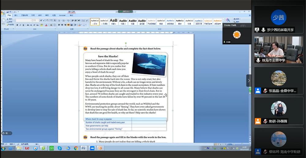 陈经纶中学的赵珺老师设计了一堂报刊阅读课,主题为食品粮食浪费。本堂阅读课参考任务型教学法的设计思路,目的是让学生真正做到“learning by doing”,并在学习过程中树立节约食物的意识,培养学生的社会责任感。专家团队对赵老师的设计给予了肯定,也建议老师明确和完善教学目标,并能在教学中适当放手,多让学生在阅读后自行对文章进行梳理。