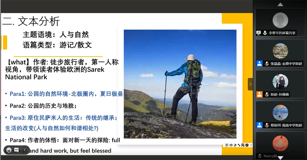 海南中学的罗璐和李春平老师合作设计新人教版选择性必修一Unit3 Lesson 1 Sarek National Park这一课的教学内容。通过一篇以游记为文本类型的语篇,教师希望学生能够对人与自然的相处方式以及人类对待自然的正确态度有所思考,进而探索设立国家公园的意义所在。专家建议两位老师对文本的知识结构图从信息的角度加以完善。
