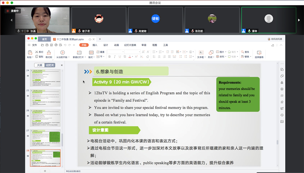 为进一步推进疫情防控期间“学科能力教学改进项目”的活动开展,促进英语教师提升教学设计,深化落实对新课标理念与内容的理解,切实发展学生的学科核心素养,2020年10月10日14:00,北京师范大学外语教育与教师教育研究所“学科能力教学改进项目”秋季学期第一次专家指导教师集体说课活动于“腾讯会议”线上圆满举行。来自金鼎中学、海南中学等6所学校的9位教师参与了本次说课指导活动;我所王蔷教授、罗少茜教授、陈则航教授、孙晓慧副教授、钱小芳副教授、潘琳副教授组成专家团队对本次说课活动进行指导和点评;研究生组成的助研团队对本次活动的成功举办给予了支持。此外,还有关注新课改和教学能力提升的三百余名教师也通过在线旁听的形式,参与到此次活动中来。