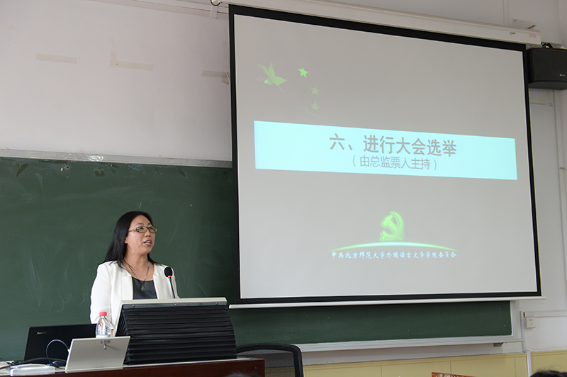 会上,刘娟老师向与会人员说明了大会的主要任务,宣读了代表选举办法,说明了代表候选人预备人选酝酿、提名的经过,介绍了总监票人、监票人、计票人。与会人员一致通过了代表选举办法、代表候选人名单、总监票人和监票人名单。在大会选举环节,学院公外教学部樊英波老师作为总监票人主持会议,有序组织工作人员发放、回收和统计了选票。
