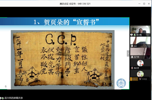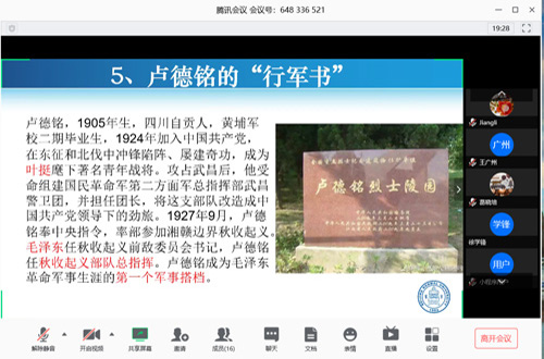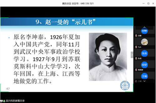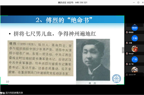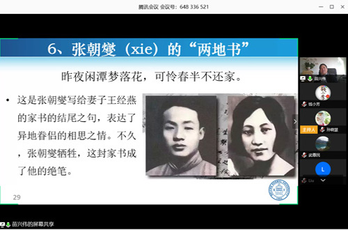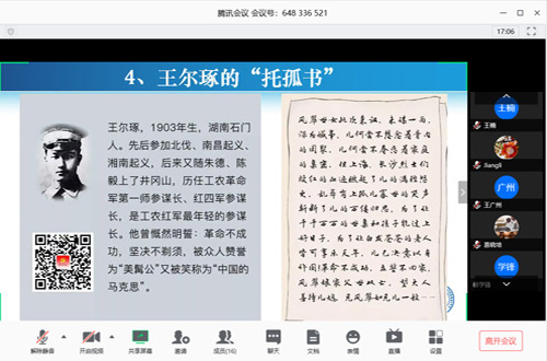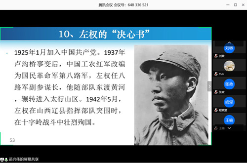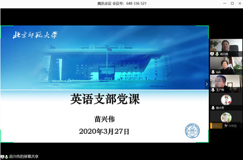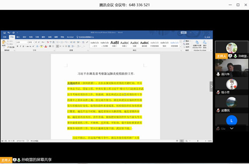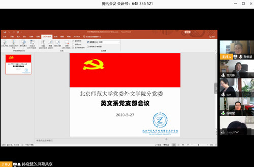 2020年3月27日下午三点半,外围买球app十大平台官网英文系党支部召开了云会议。会议由英文系党支部书记孙晓慧老师主持,通过腾讯会议平台,采取屏幕分享和发言讨论的方式进行,共有十六位党员同志参加了此次云会议。会议首先邀请苗兴伟院长给大家上党课,讲述“十一书”的故事,包括贺页朵的“宣誓书”、傅烈的“绝命书”,寻淮洲的“请战书”,王尔琢的“托孤书”,卢德铭的“行军书”,张朝燮的“两地书”,陈毅安的“无字书”,夏明翰的“就义书”,赵一曼的“示儿书”,左权的“决心书”,陈然的“明志书”。苗老师的党课图文并茂,声情并举,参会同志表示党课学习使我们感受到了革命烈士浴血奋战,拼搏奋发,以革命事业为首任的伟大使命感。随后,孙晓慧书记带领大家学习了习近平总书记在湖北省考察新冠肺炎疫情防控工作时的重要讲话精神。支部党员同志纷纷表示在当前局势下将以抗击疫情和教学科研工作并重,一起努力度过困难时期。此外,孙晓慧书记向大家汇报了英文系党支部本学期的主要支部工作计划,详细讲解了每个月份主要的支部活动计划。