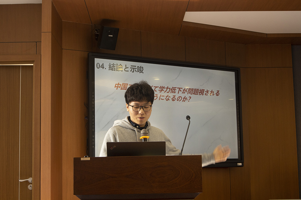 宿久高教授在点评中指出:同学们选题的理论意义、现实意义、学术意义均达到了一定的水平,反映出同学们的问题意识有提高,有助于提高同学们思维能力、思辨能力、分析问题和解决问题的能力。本次社会文化方向的选题既有现实的也有历史的,较之以往相对集中在语言与文学两个方面,有了大幅度的拓展。同学们在资料的运用方面比较成功,说明在研究方法的掌握上达到了一定的水平。同学们的汇报、答辩均使用日语,说明同学们在语言的运用及思维的表达上也达到了一定的水平。从本次参赛的论文来看,不少同学是在日本留学期间在日本教师的指导下形成的论文或论文的思路,但在结论的抽象、观点的导出时,需要关注作为中国日语学习者的视角和基本出发点,特别是一些词语的使用上尤其需要关注。在标题、内容和结论之间的逻辑关系还需要进一步把握其统一性。