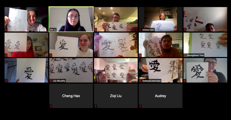 与此同时,负责威玛中文项目学分课程的李欣老师则在线上把中国书法课上得有声有色。学生们在家中拿起了毛笔,在纸上写下了一个个中国字。浓浓的中国“爱”在线上播撒开来。
