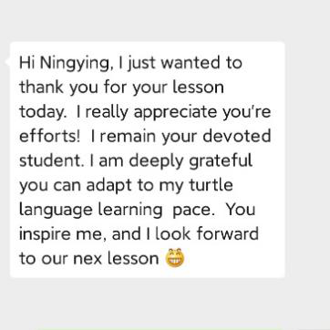 在摸索和尝试中,林宁英逐渐熟悉Zoom授课的模式。在开展网络课程前,及时联系小学生的家长,做好网课的预备及课堂纪律的配合管理,帮助年长的学生熟悉网课的操作。此外,林老师在课程的前一天都会给学生们发送上课材料,包括课堂测试、课文、练习及作业等。在提前的指导和预备下,网络课程顺利进展,反响甚好,消除了学生们对网课操作及教学效果的疑虑,也坚定了教师在这特殊时期进行网络授课的信心。