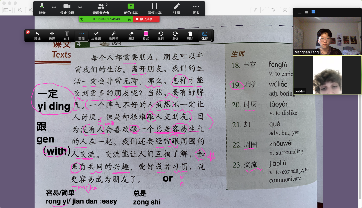 同为志愿者教师的冯梦楠也开展了线上一对一教学,Zoom平台丰富多样的功能使得教学更加高效顺畅。“随讲随记”的线上标注功能受到了学生的好评,笔记一目了然,随时都可以回顾温习。