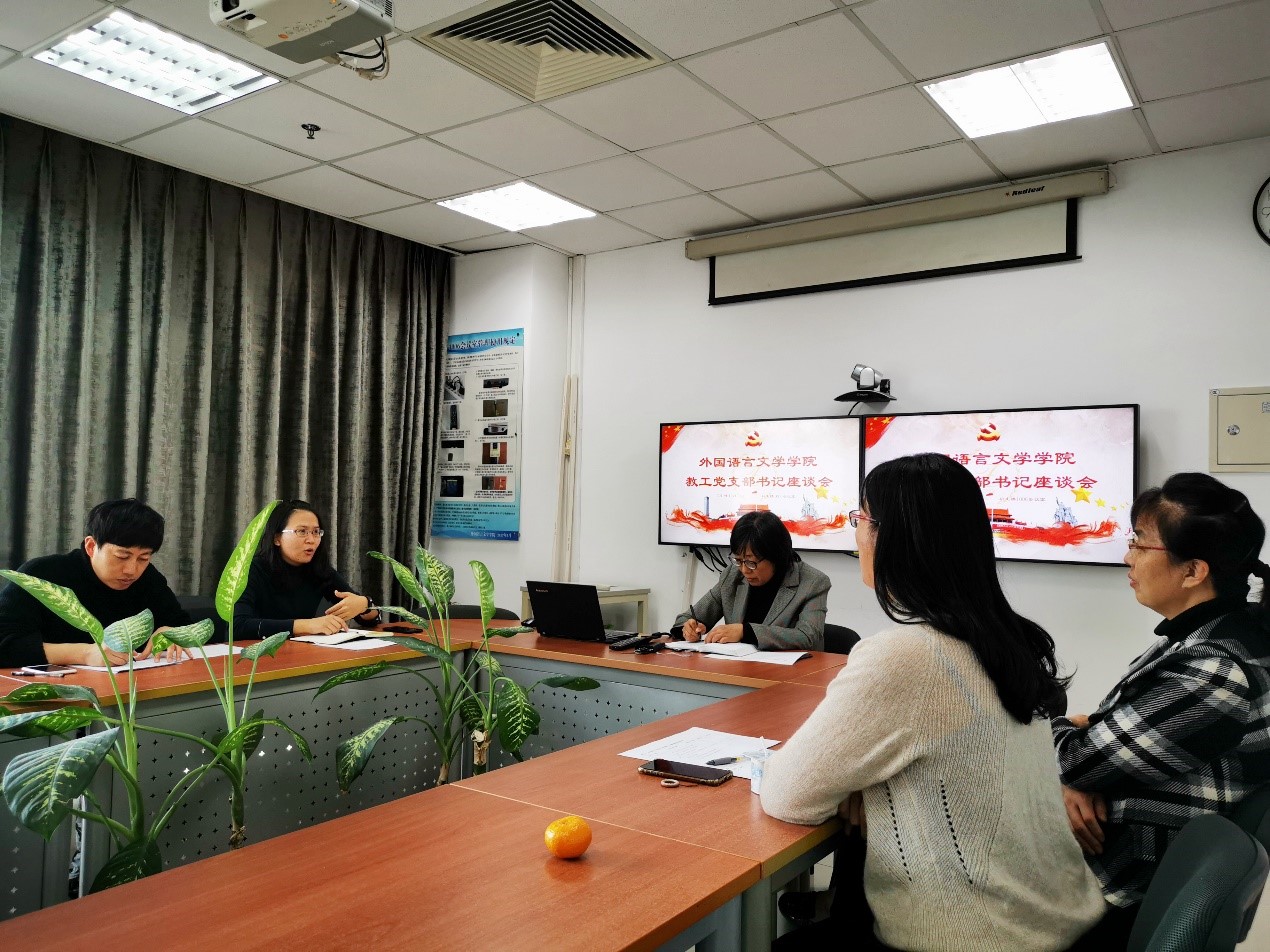 在调研过程中,各位支部书记主要提出了在学校“一体两翼”的办学格局下,赴珠海参与短期教学工作的老师无法正常参加组织生活的问题,以及由于教学时间各异而导致无法全员参加组织活动的问题。同时,俄文系党支部 书记杨衍春老师向与会书记介绍了本支部的特色活动,将党建活动与专业相结合,既有利于教学科研、学科建设,又能及时向非党员教师介绍和宣传党的最近理论成果和相关政策。