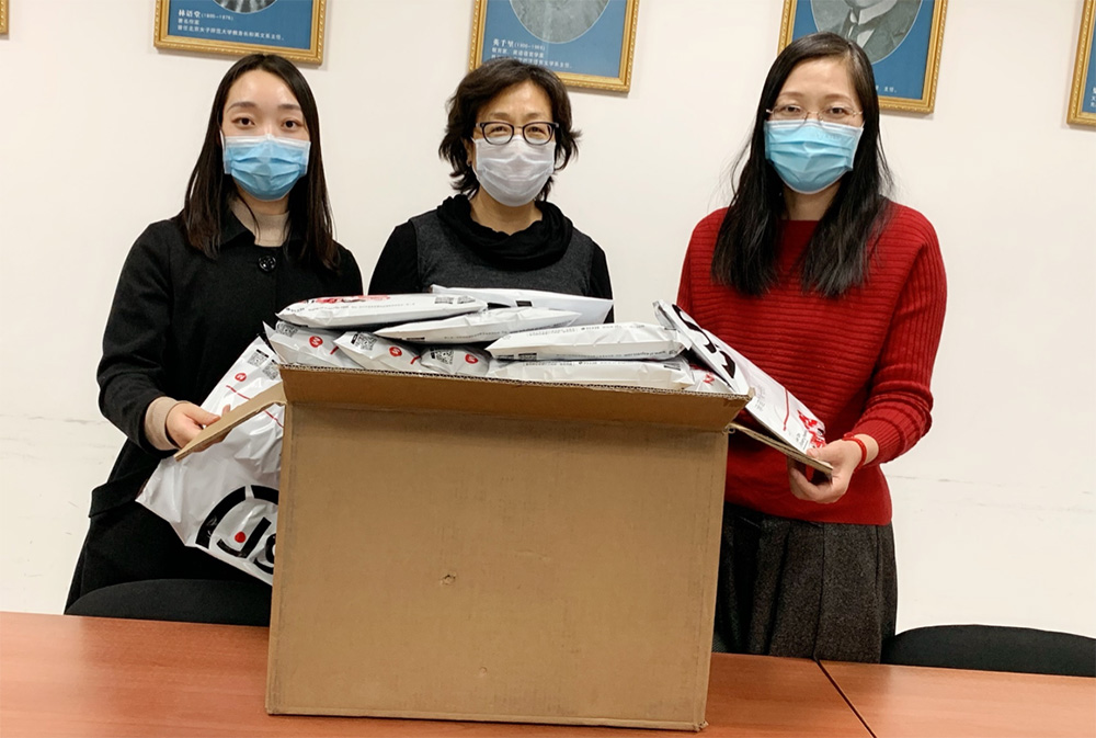 学院高苗苗老师、张新颖老师、刘冉老师、张力青老师迅速联系境外的中外师生获取他们的邮寄地址,高苗苗老师、陈则航老师跑了几个药店、超市采购物资。学院领取了学校和国际处支持的爱心口罩后,在书记刘娟老师、院长苗兴伟老师的带领下,包含着学校和全院师生满满爱心的不同包装、不同品牌的口罩被装进了48个爱心包裹,发往美国、英国、俄罗斯、日本、韩国等多个国家!希望学校和学院对境外师生的牵挂、关心和殷切期盼能够随着包裹穿越千山万水、漂洋过海到达每一位境外师生的“手里”和 “心里”。