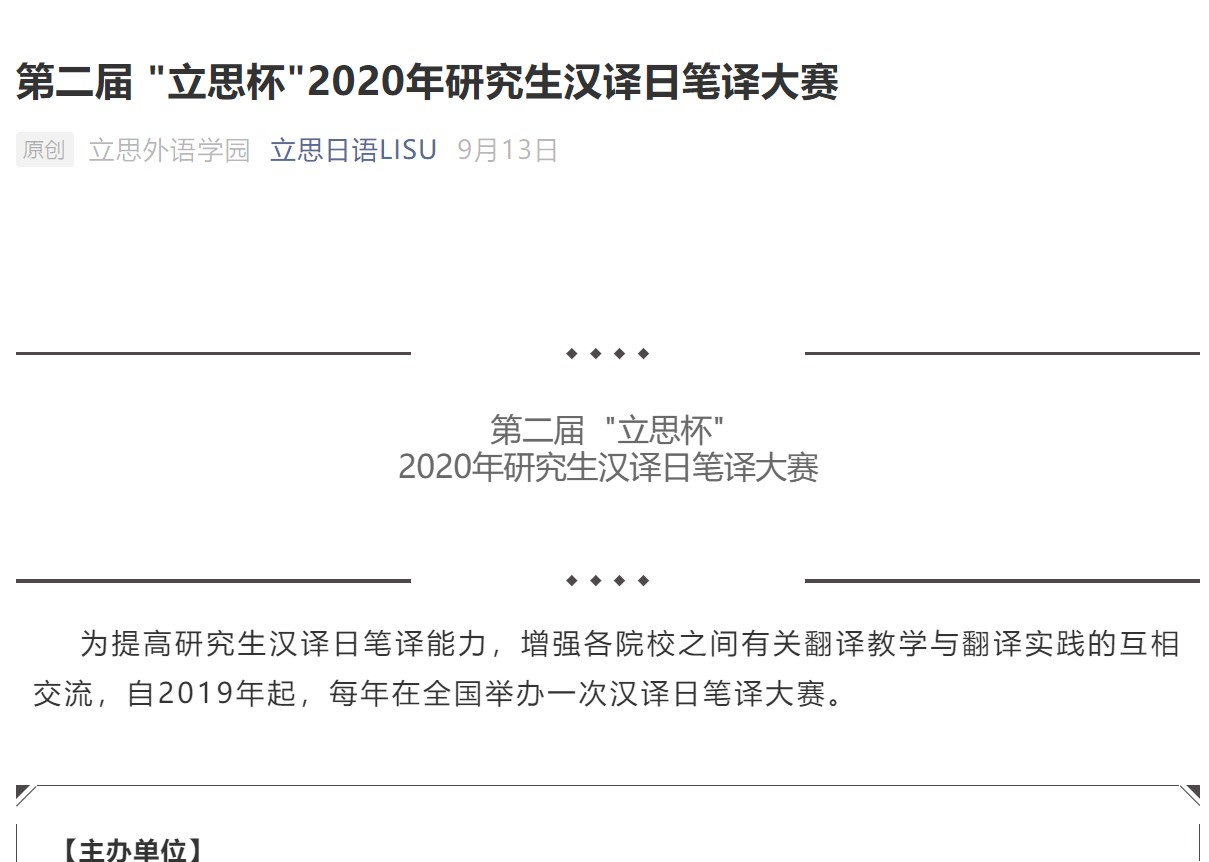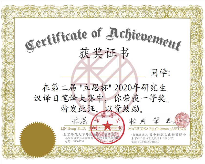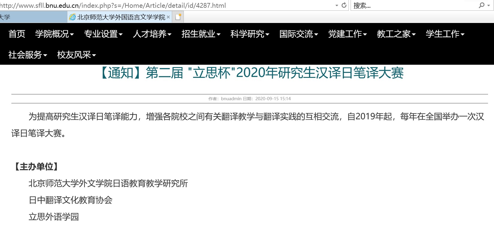 历经4个多月的筹备,由北京师范大学外围买球app十大平台官网日语教育教学研究所(微信公众号:BNURYJX)、日中翻译文化教育协会(http://setacs.org/)、立思外语学园(微信公众号:LISU_JPedu)主办的第二届“立思杯”研究生汉译日笔译大赛(全国)于2020年11月14日落下帷幕。