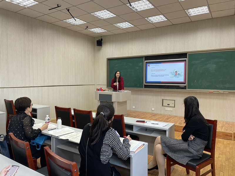 对于张老师的试讲课,陈教授表示,张老师的整堂课总体思路清晰,并从课堂活动中的各个小细节,给到张老师改进建议。陈教授指出,在听第二遍并记笔记这个环节,既然是给到学生表格,老师可以先让学生根据表格上的内容,对听力内容进行预测并讨论,因为推测本身也是为后面的听力做准备;当学生听不懂时,不能一遍一遍回放,可以带学生们分析一下为什么听了几遍还没到位,可以让学生们自己来说说,老师也能对症下药,给予学生有针对性的指导。除了对学生的听力技能进行指导以外,张老师还可以引导学生对作者提出的未来职业技能进行评价,并提出自己的预测,围绕主题展开讨论,形成对未来生活的期待并知道如何从现在开始做好准备。