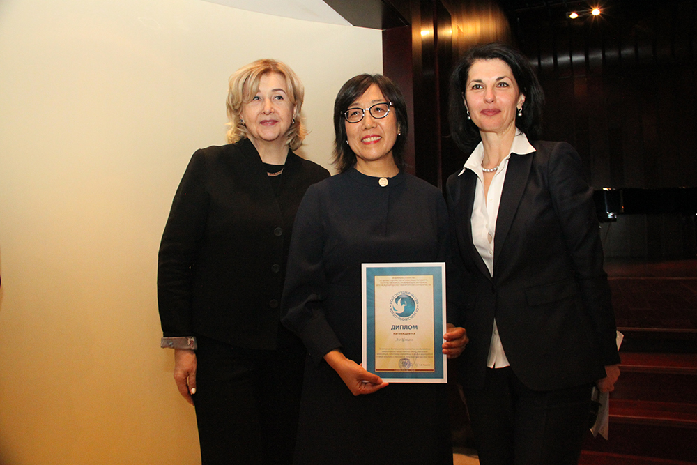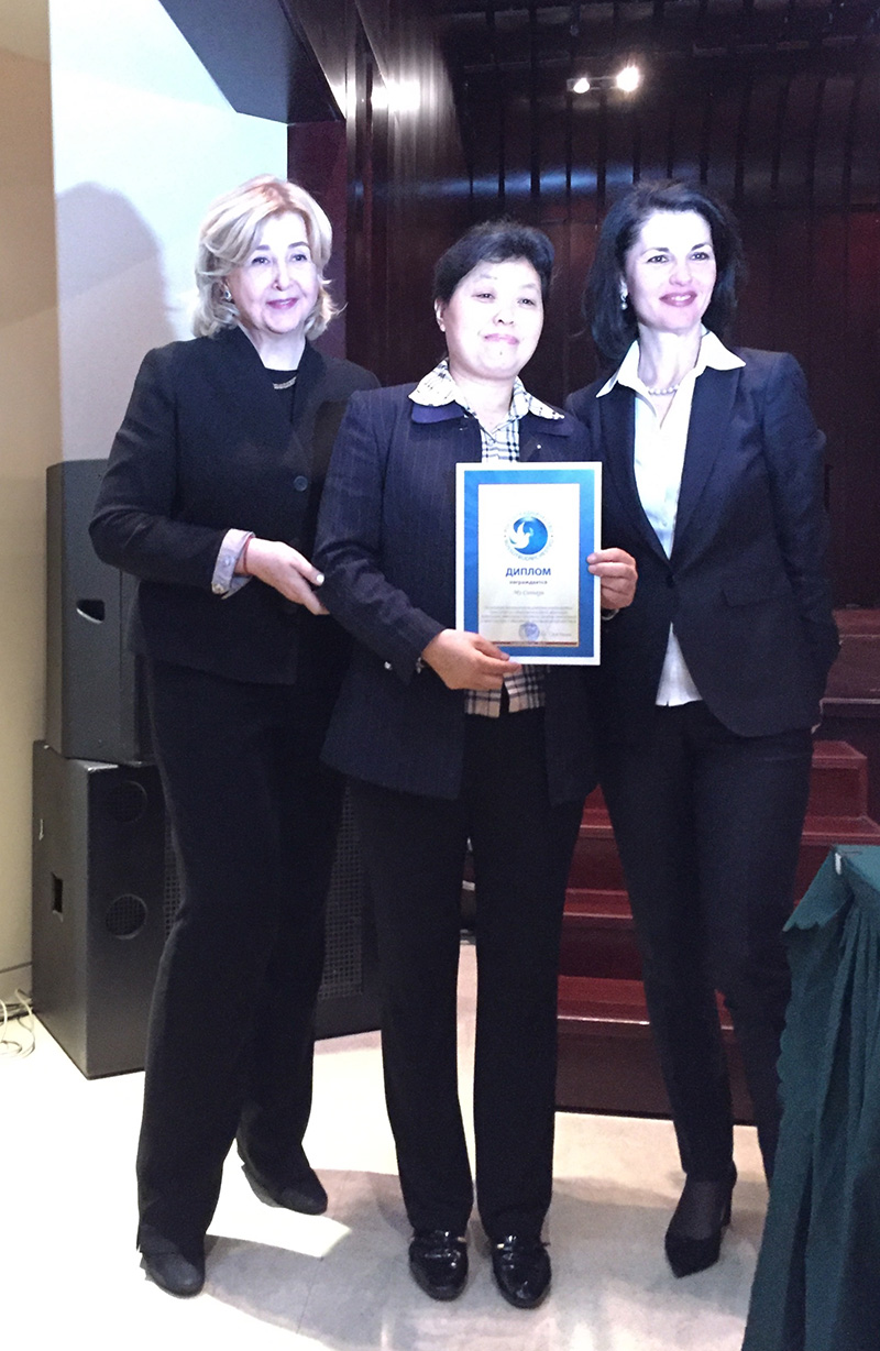 2018年10月19日外围买球app十大平台官网俄文系教师刘娟和穆新华在北京俄罗斯文化中心接受俄罗斯联邦国际人文合作属颁发的荣誉证书。俄罗斯联邦科学与教育部副部长Марина Александровна Боровская女士受国际人文合作属委托向获奖者颁发证书。