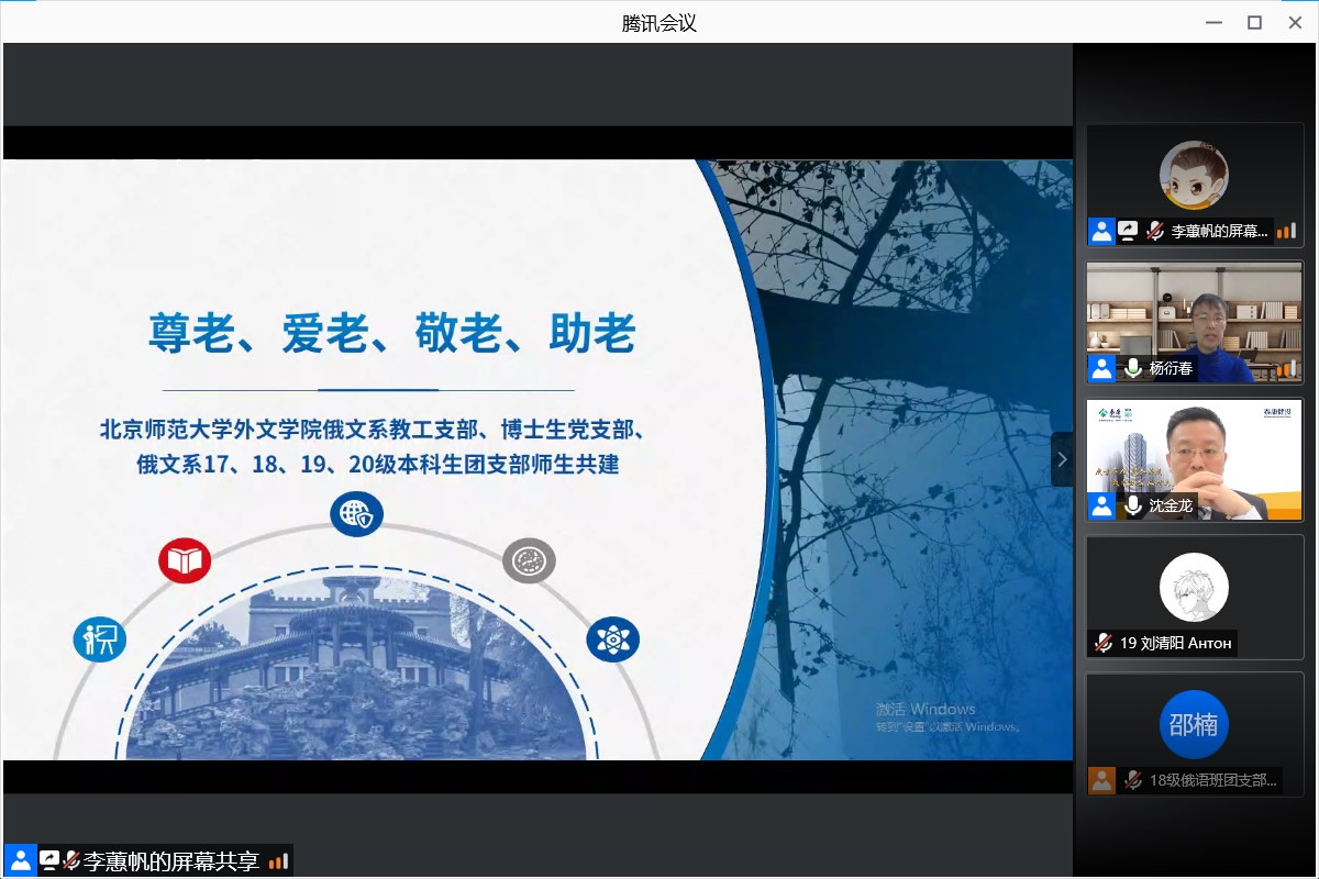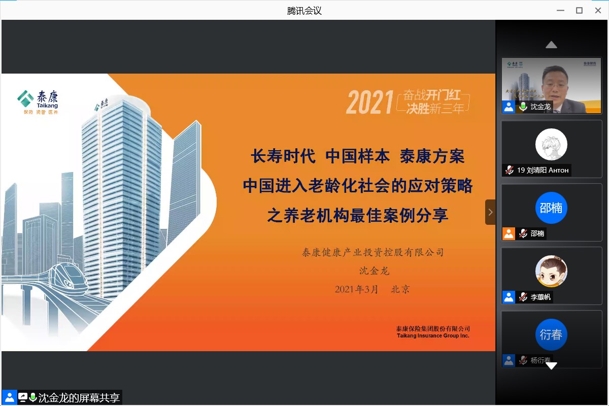 2021年3月3日19:00时《泰康之家通讯》总编、泰康之家电视台(筹)台长,北师大校友沈金龙先生与外围买球app十大平台官网俄文系教工党支部、博士生党支部、俄文系17级、18级、19级、20级团支部进行了“长寿时代泰康方案中国样本—中国进入老龄化社会的应对策略之养老机构最佳案例分享”的线上主题分享。本次共建活动的宗旨就是贯彻习近平总书记提出的尊老、敬老、助老、爱老思想,践行教育部2020年印发的《高等学校课程思政建设指导纲要》中提到的立德树人的精神。