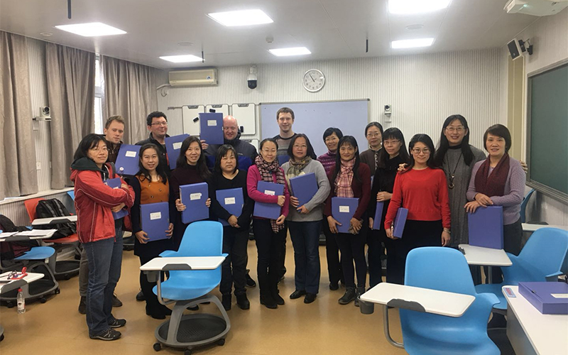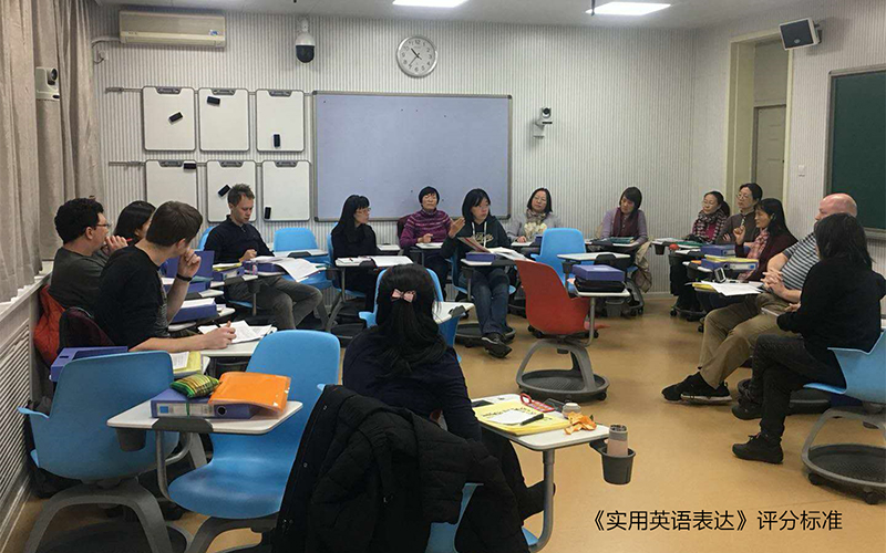 《实用英语表达》课程的期末口语考试评分标准的研讨特邀9名学生志愿者作为考生,由一名外教担任主考官,随后全体教师就评分标准进行讨论并将讨论全过程录像以作为今后的重要参考。